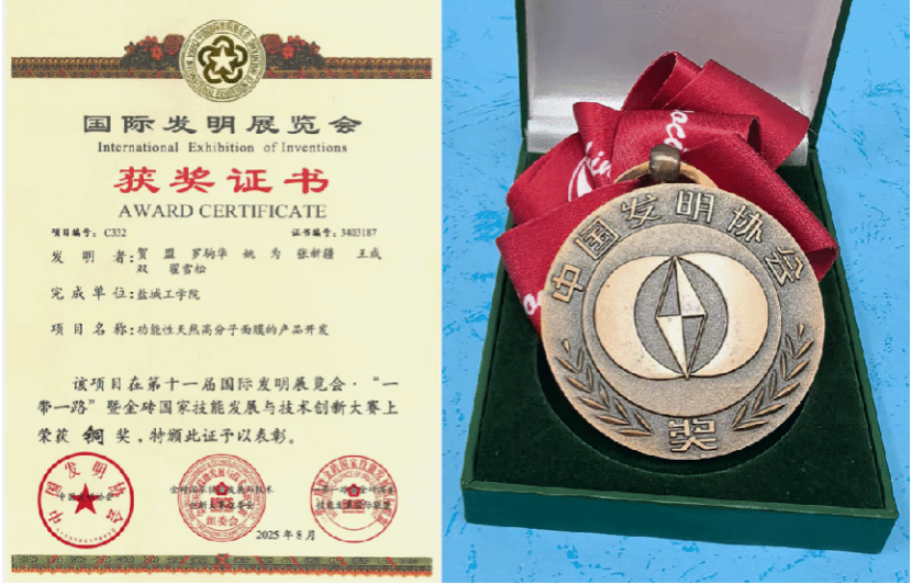 在刚刚落幕的第十一届国际发明展览会暨“一带一路”金砖国家技能发展与技术创新大赛上,经专家评审委员会严格评审,盐城工学院吕氏贵宾会网址0022申报的“功能性天然高分子面膜的产品开发”项目获得铜奖。项目主要完成人为贺盟博士、罗驹华教授、姚为教授、王成双教授和翟雪松博士等。该项目最大的特点在于以农业和食品废弃物中的纤维素和甲壳素等天然高分子为原料,通过创新技术制备出兼具高保湿性、良好抑菌性和完全可降解性的高性能面膜产品。这不仅为皮肤护理提供了更绿色、温和的选择,也符合可持续发展和高质量发展理念。