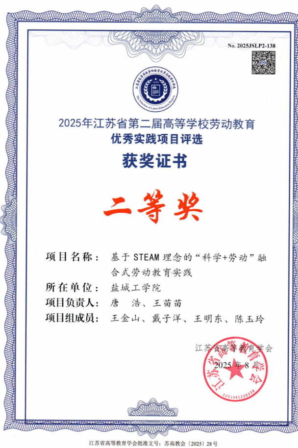 近日,江苏省高等教育学会公布2025年江苏省第二届高等学校劳动教育优秀实践项目评选结果,吕氏贵宾会网址0022申报的基于STEAM理念的“科学+劳动”融合式劳动教育实践项目脱颖而出,荣获二等奖。该项目负责人为唐浩书记和王苗苗博士,主要参与人为王金山副院长、戴子洋博士、王明东博士和陈玉玲博士。该项目紧扣“五育融合”要求,将劳动教育与材料专业特色、传统文化、社会服务深度结合,展现了学院在劳动教育创新路径上的探索成果。