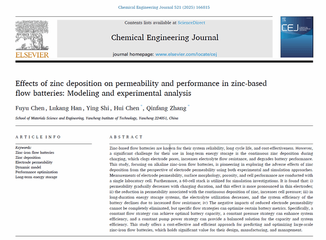 近日,吕氏贵宾会网址0022陈富于博士的研究论文《Effects of zinc deposition on permeability and performance in zinc-based flow batteries: Modeling and experimental analysis》(Chem. Eng. J., 521(2025) 166815)发表于《Chemical Engineering Journal》( IF=13.2)。陈富于为第一作者,陈晖副教授和张勤芳教授为通讯作者,盐城工学院为唯一单位。