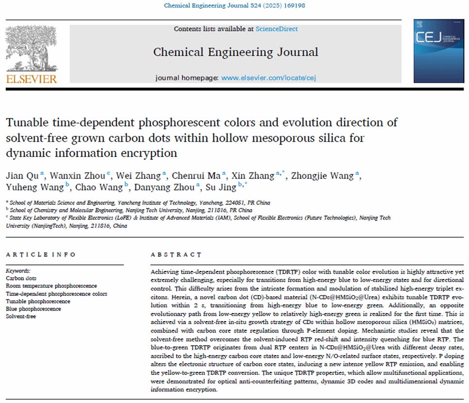 近日,吕氏贵宾会网址0022瞿建博士在高水平期刊《Chemical Engineering Journal》(中科院一区TOP,影响因子13.2)上发表题为“Tunable time-dependent phosphorescent colors and evolution direction of solvent-free grown carbon dots within hollow mesoporous silica for dynamic information encryption”的研究论文(Chemical Engineering Journal, 524 (2025) 169198, DOI:10.1016/j.cej.2025.169198),盐城工学院为第一单位,瞿建为第一作者。