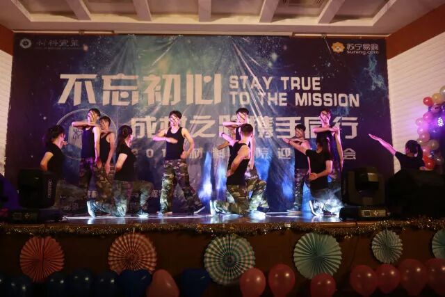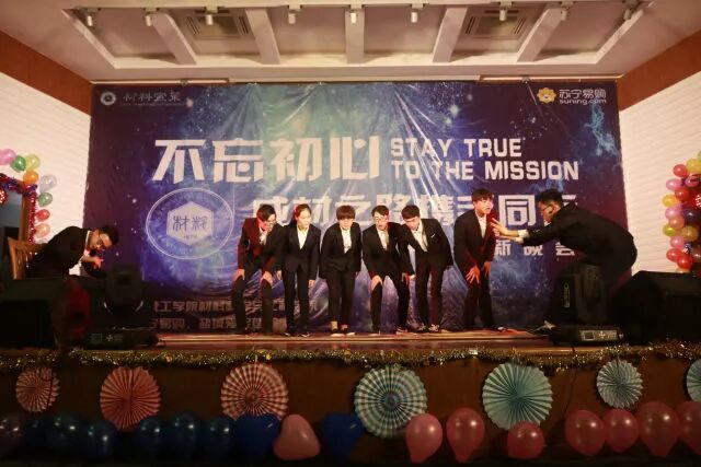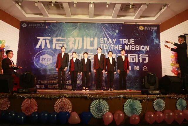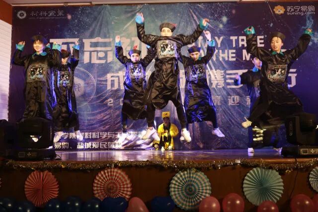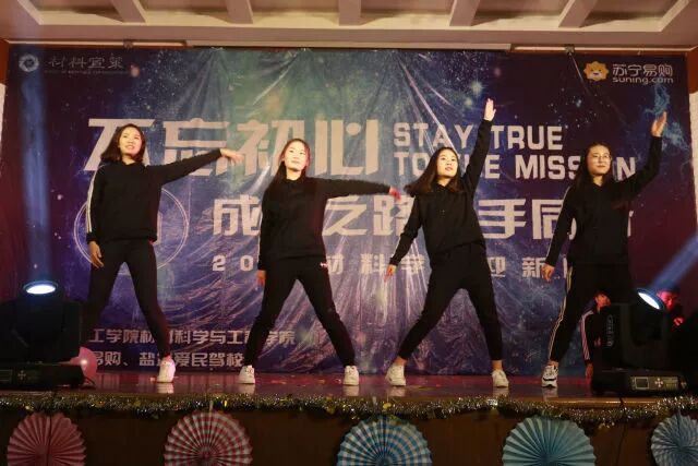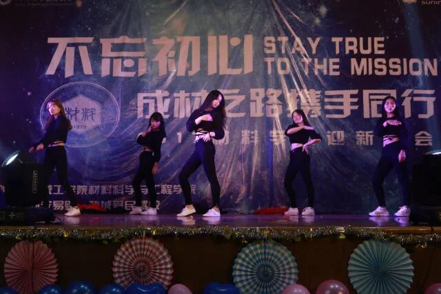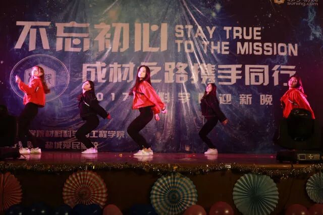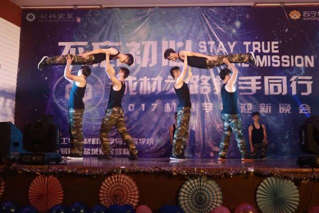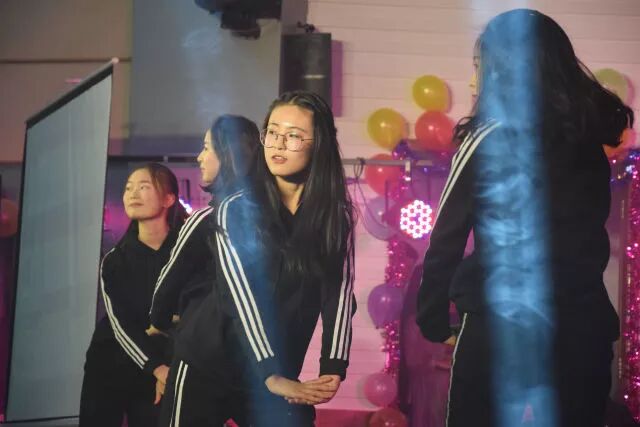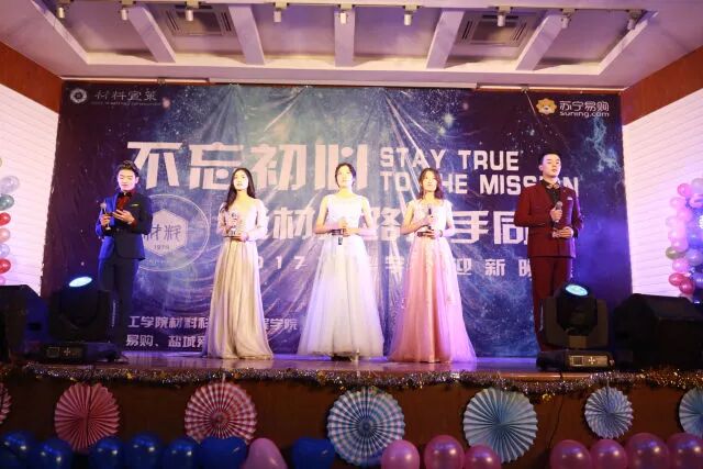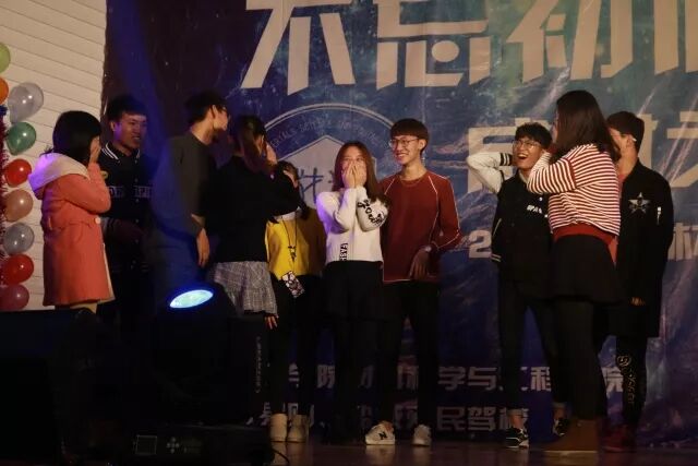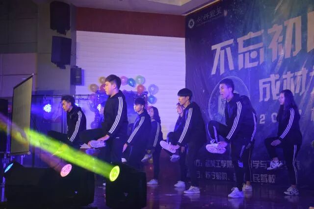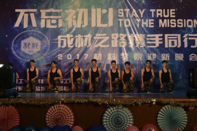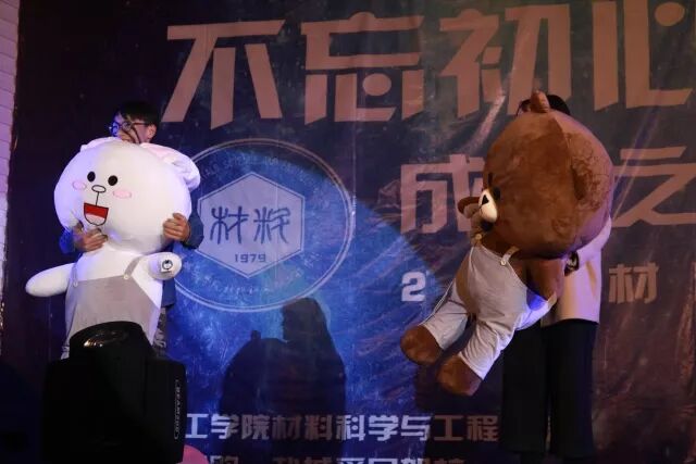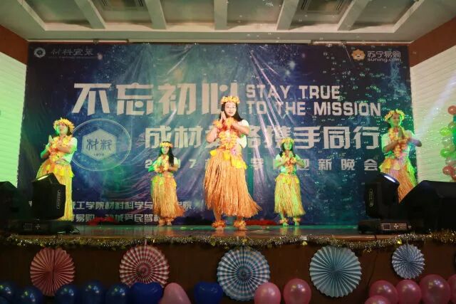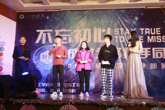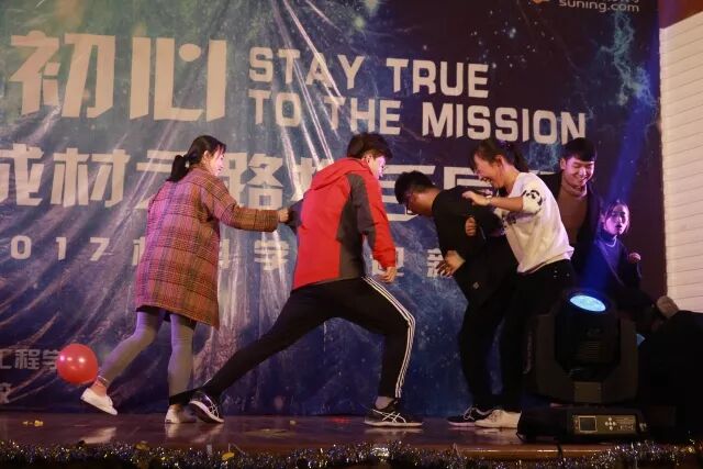 精彩的节目中晚会还为材子们准备了游戏环节,男女合作各自将一条腿绑上连起来,女生另一条腿绑上气球,哪组气球被踩爆就算淘汰,不仅上台参加游戏的人兴奋不已,就连台下的材子们都兴致高昂!